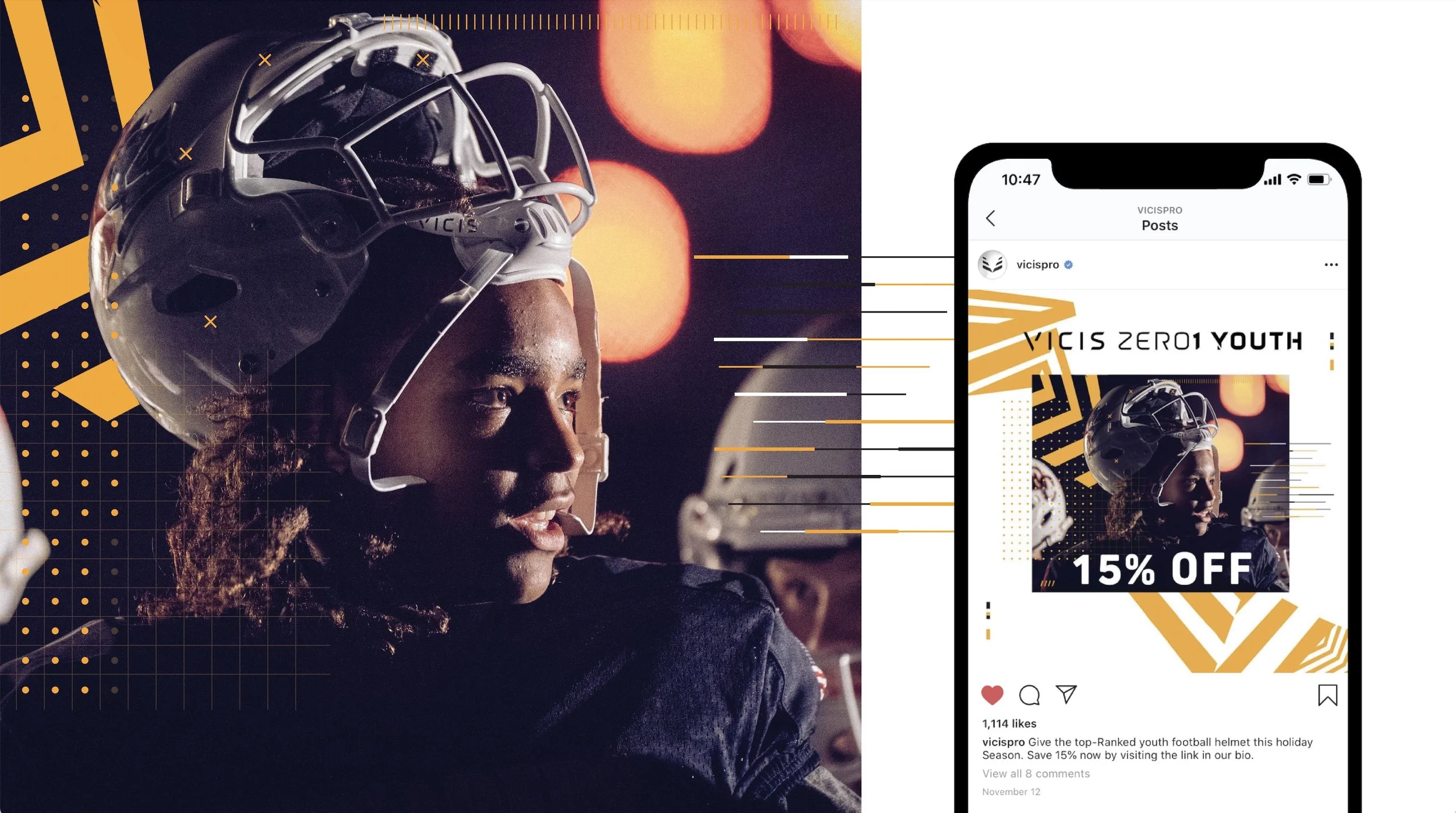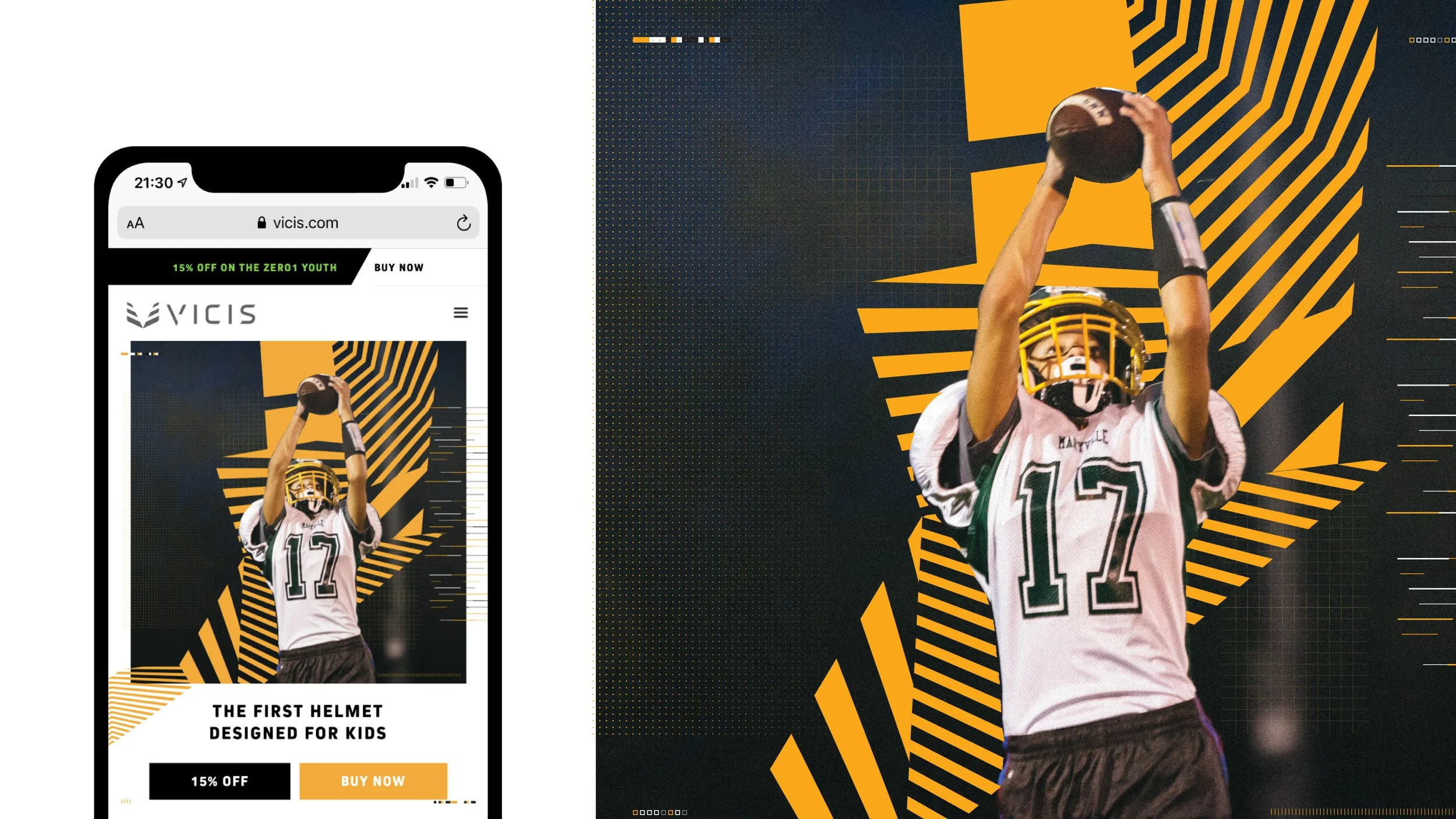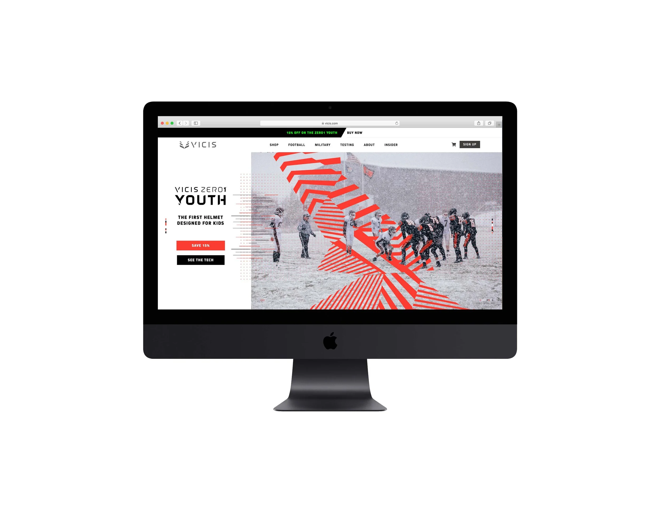 This campaign was created to promote a discount on youth products to get as an early Christmas gift. This project consisted in creating a set of images for our website, social media accounts, and email banners. The design approach was a combination of VICIS technology and sports movement which is reflected in the dazzle pattern and the change of colours.
